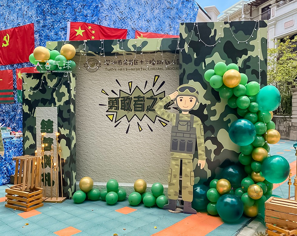 本次典礼的背景布置以军事迷彩为主题,采用迷彩图案的KT板、布帘和立体装饰,展现出勇气、坚韧和成长的力量。背景上融入幼儿园的Logo和“勇敢之夜”主题字样,让每个孩子都在这个特殊的场合中感受到自己是一个小小勇士。