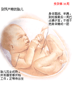 胎儿现在还在继续长肉,这些脂肪储备将会有助于宝宝出生后的体温调节。这个小家伙的身体各部份器官已发育完成,其中肺部是最后一个成熟的器官,在宝宝出生后几个小时内他才能建立起正常的呼吸模式。