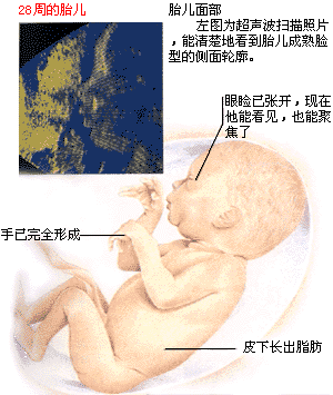 现在胎儿的体重在800克左右,坐高约为22厘米。皮下脂肪开始出现,但并不多,胎儿还是显得瘦瘦的,全身覆盖着一层细细的绒毛。