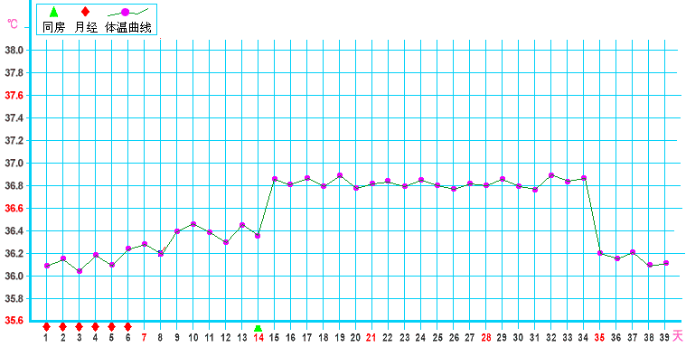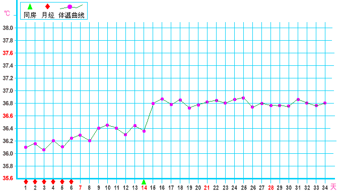 图示为已经怀孕的基础体温曲线图,高温从第15天持续到第34天,已经持续20天。一般来说高温持续超过16天就是怀孕的征兆。