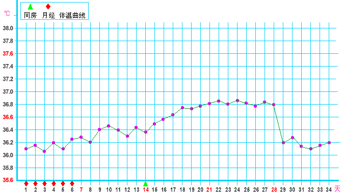 上图表示正常月经周期28天,基础体温曲线呈现标准的高低温两相变化。从月经开始-排卵日,低温期14天;排卵后持续高温14天,其中第14天为排卵日。
